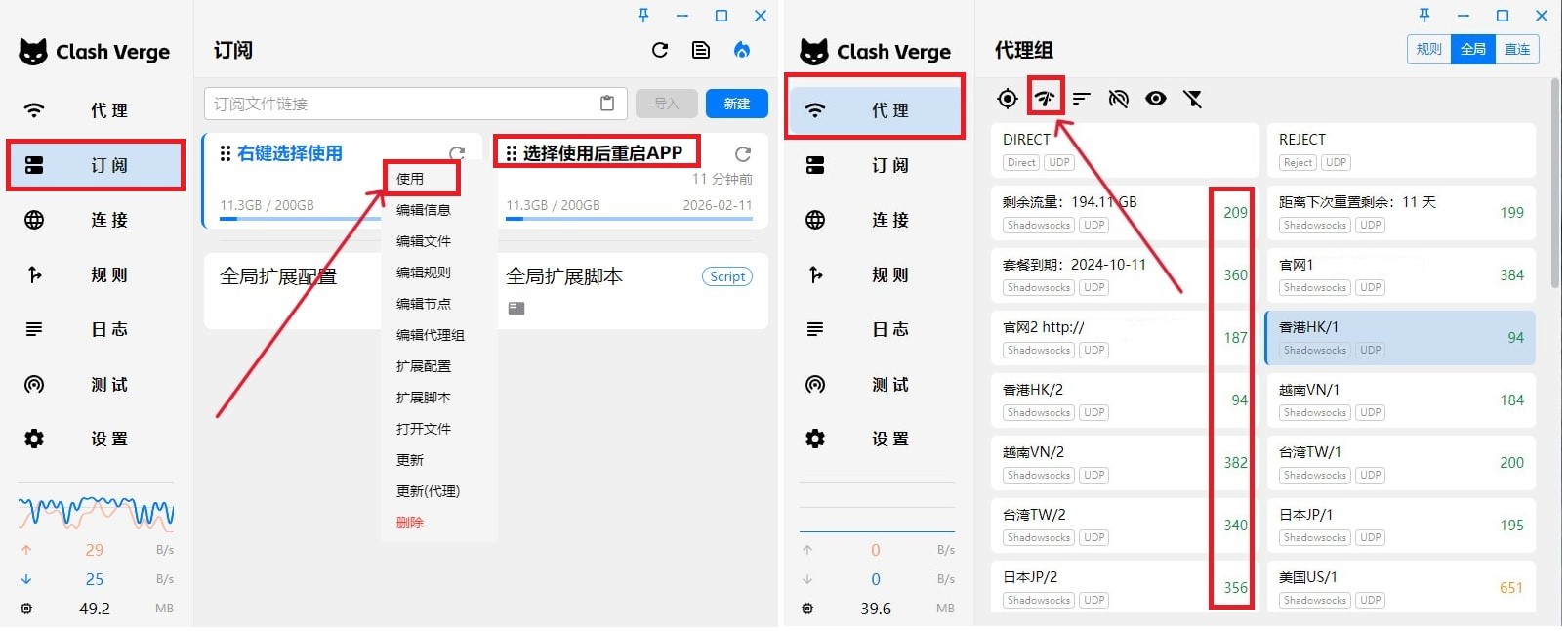 1. 打开 Clash Verge 选择 [订阅] 选择导入的订阅右键 [使用]