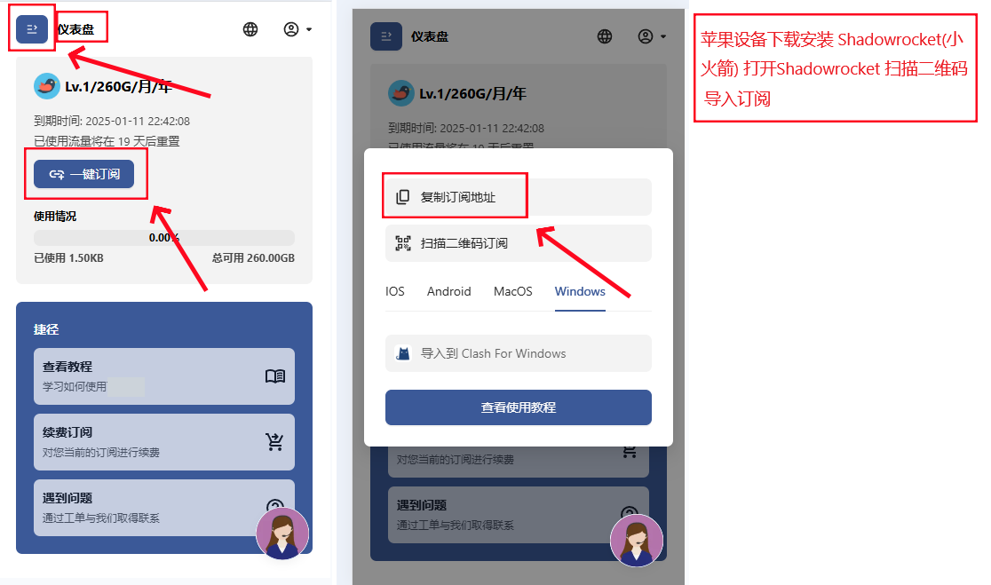 1. 回到 [仪表盘] 点击 一键订阅 选择 [复制订阅地址]
